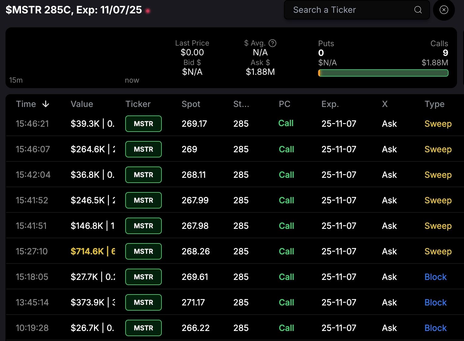 MSTR has been beat up over the past few months. The stock is way down from all time highs. Painful for current shareholders but an opportunity for those who don’t yet own the stock. Flow was coming in bullish on Friday. I’ve selected the $285 strike to show you. While I am showing you this, I’d prefer a little bit of a longer contract on mstr. If i make a trade on it I’d probably go 6-8 weeks on the expiration. I did buy shares of the stock on Friday as I think we are near capitulation range on the price per share.