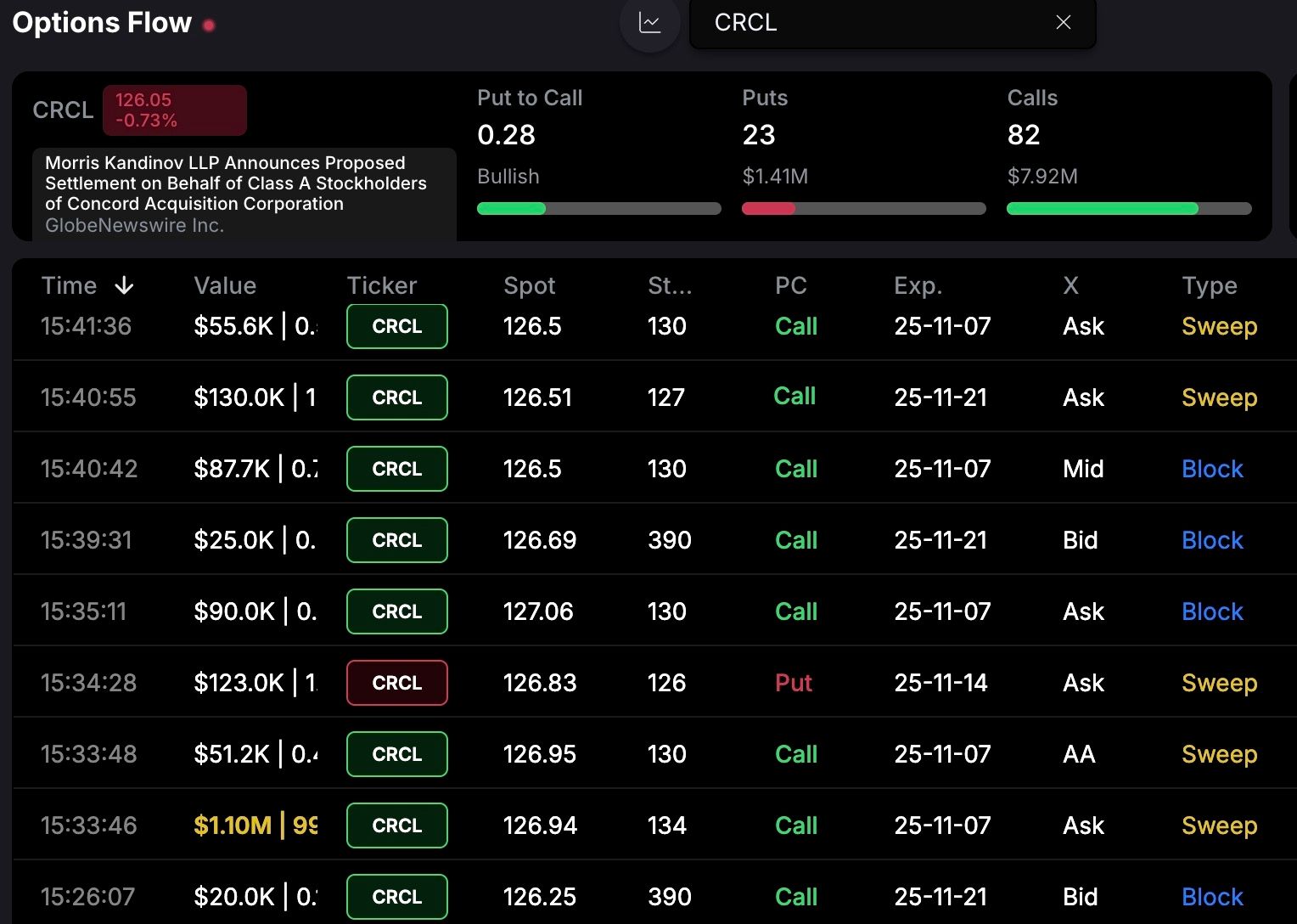 I continue to watch CRCL as a turn around play as well. Large orders continue to come in on CRCL at various strikes and various expiration dates. I do tend to believe that just like MSTR, CRCL is near the bottom of its current slide and due for a strong bounce. They do have earnings coming up in about a week and obviously that could be the catalyst should they report good numbers.