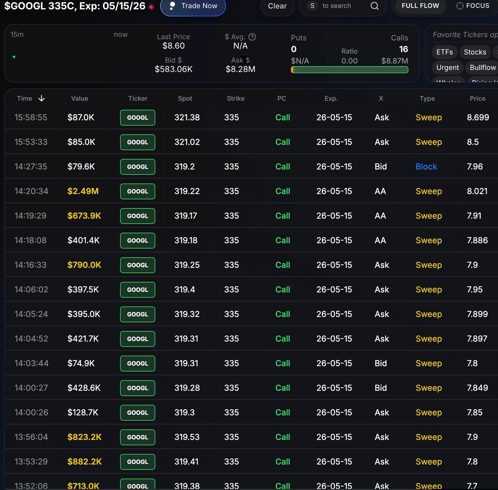 This flow triggered my favorite alert which is the “Urgent Repeater” alert. We had massive volume of nearly $9 million in premium come across this contract. These were primarily sweep orders that were filling at ask or even above ask. This type of urgency is always interesting to say the least. Being able to see an order like these come through tells me that we may be preparing for the next leg up in GOOG. If you look at enough options flow, you can begin to tell what is truly bullish and what is just hedging or part of a multi leg trade. This one looks directionally bullish to me.