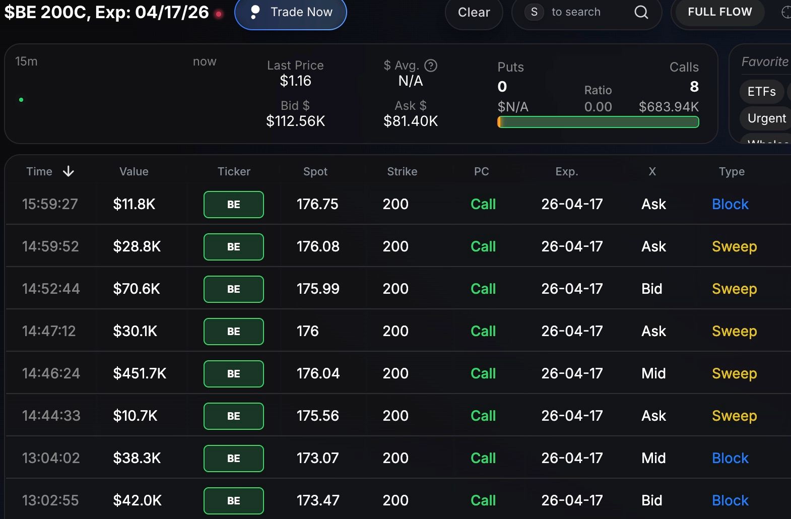This one slipped in right towards the end of the trading day. This one is interesting because of the amount of volume that came in on BE to be as far out of the money as this contract is on a short term expiration. Either someone is absolutely throwing money away, or BE could be looking at a massive jump this week.
