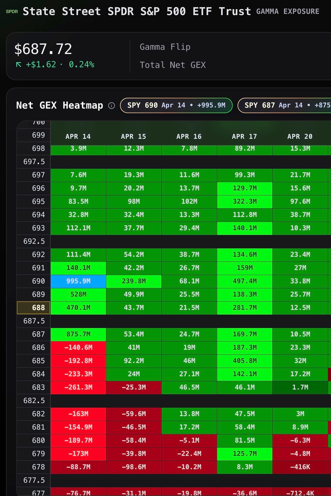 Current SPY update shows us up about a quarter of a % premarket. The largest pocket of gamma is located at the 690 strike showing that there could be some positioning overhead. This positive gamma will act as a resistance of sort. However, should it build up rapidly it can act as a magnet for price and begin to pull the market towards it. We will have a better understanding once the market opens and we begin to see the reshuffling of gamma.