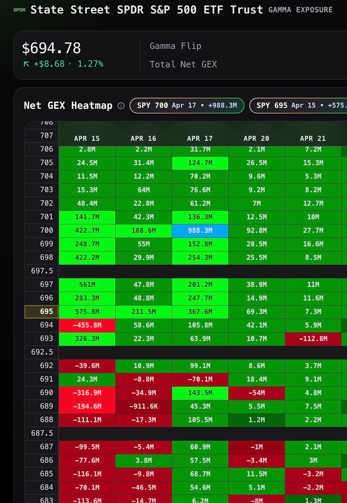 We are stacked with positive gamma overhead and some thinner negative gamma below as we start the day today. The magnet node continues to be that $700 strike with a friday expiration. Based on what I see at the present moment, I believe the melt up towards 700 SPY continues today. We are still in a news driven market, but gamma exposure is starting to take more control again as the market has grown a bit numb to the constant news of back and forth in the geo political realm.