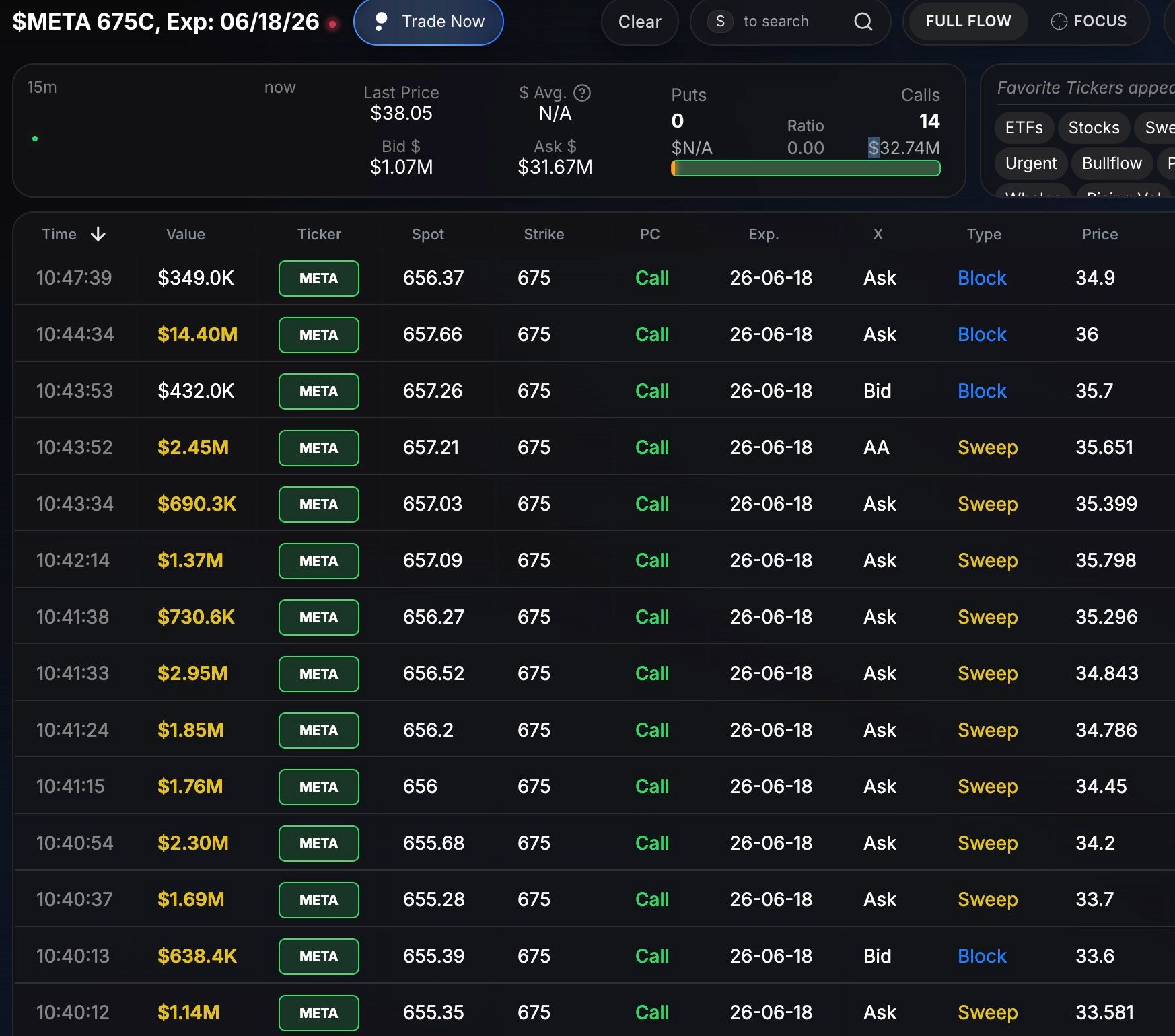 This particular flow triggered the urgent repeater alert, which is my favorite. The crazy thing about this one is nearly $32 million of volume came through on this contract today. This one seems impactful. The strike price is OTM but not so much so that it can’t quickly become in the money with a few green days from META. These were filled aggressively with sweep orders and primarily filled at the ask, both of which are bullish. This one is on my list to watch tomorrow.