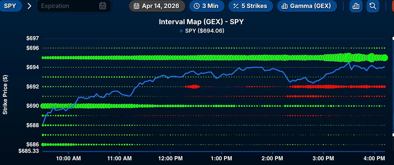 Our SPY analysis was spot on as we projected 690 to act as a magnet for SPY and pull the price upwards. As the day went on, we saw 695 become the magnet. We overlaid GEX information and price movement to show you the profound impact this info has!